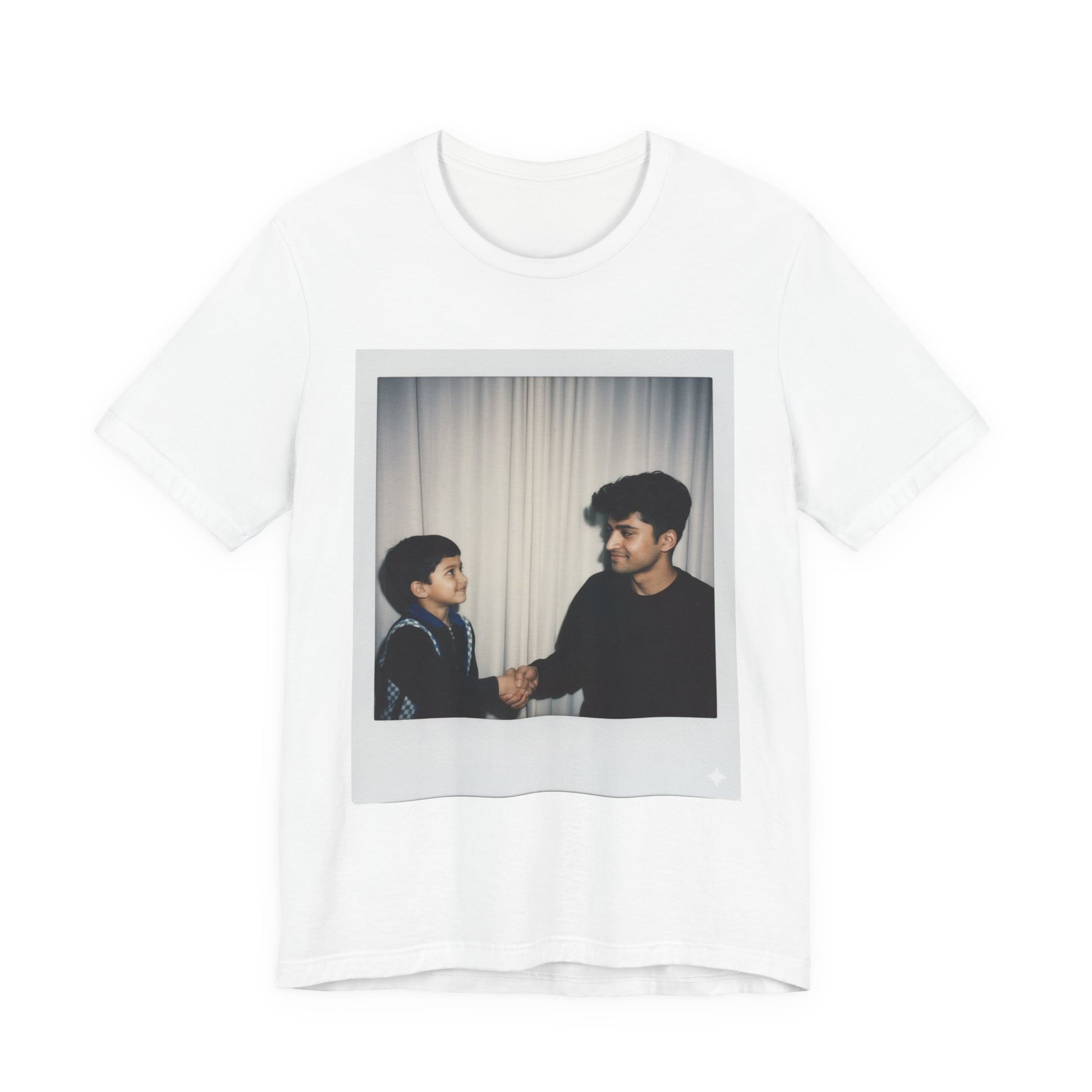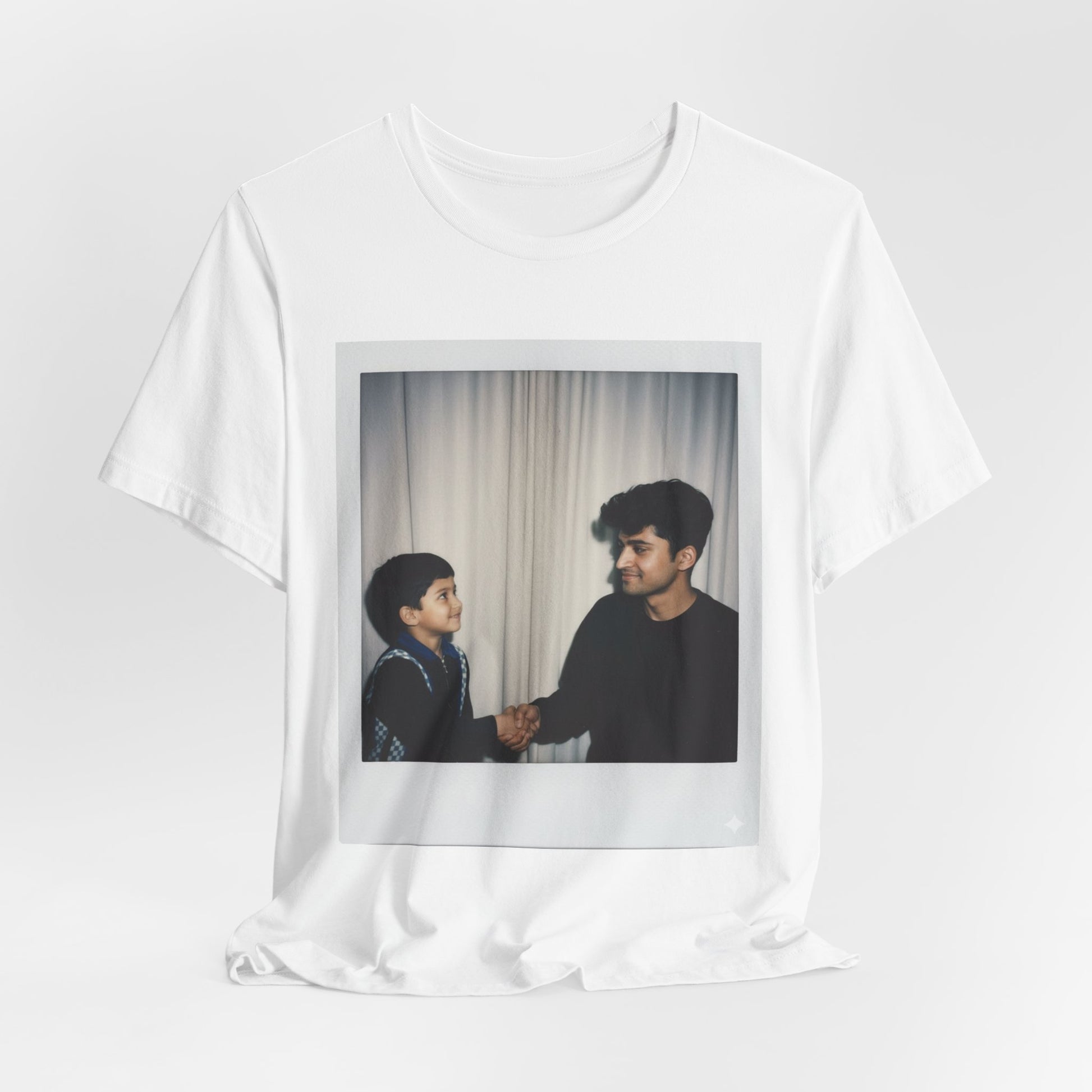 A soft, breathable crewneck tee that carries a quiet moment — two people sharing a grin and a handshake framed like a Polaroid. Lightweight Airlume cotton feels gentle on the skin while the retail fit keeps the silhouette tidy under a jacket or out on its own. Thoughtful construction details — side seams, ribbed collar, shoulder tape and a tear-away label — mean this shirt wears comfortably and keeps its shape. The printed frame gives the design a nostalgic, intimate feel that suits casual days, meetups, and everyday storytelling.